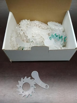 Antes cuando yo fabricaba el telar Amona Micro Loom, el trinquete lo fabricaba en hertacetal que es un plomero que tiene unas características semejantes a muchos metales, pero esta vez los he realizado en policarbonato de 3mm ya que en el láser se corta muy bien y aguanta bastante.