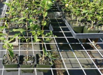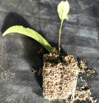 3 eta 4 hilabete artean errotuta egondo da (7. irudia). Aldaxkak 12cm -ko sakonera duen lorontzitan sartu behar dira. Berriro ere, oso garrantzitsua da sustratoa ondo drainatuta egotea. Perlite eta vermiculitoaren nahasketa erabili dezakegu. Landare Tropikaletako Baliabide Genetikoen Kudeaketa Unitateak 1: 1: 1 – eko nahasketa bat erabili du perlita, vermikulita eta turberarekin. Landare hauek hasieran %50ko itzalean eduki daitezke, eta gero eguzki betean jartzen dira. Ureztatzeko, astiro askatzen den ongarri oso bat erabili behar da. Landareak landatzen hasi eta landareak lurrean jartzeko prest egon arte (8. irudia), urtebete inguru pasa daiteke